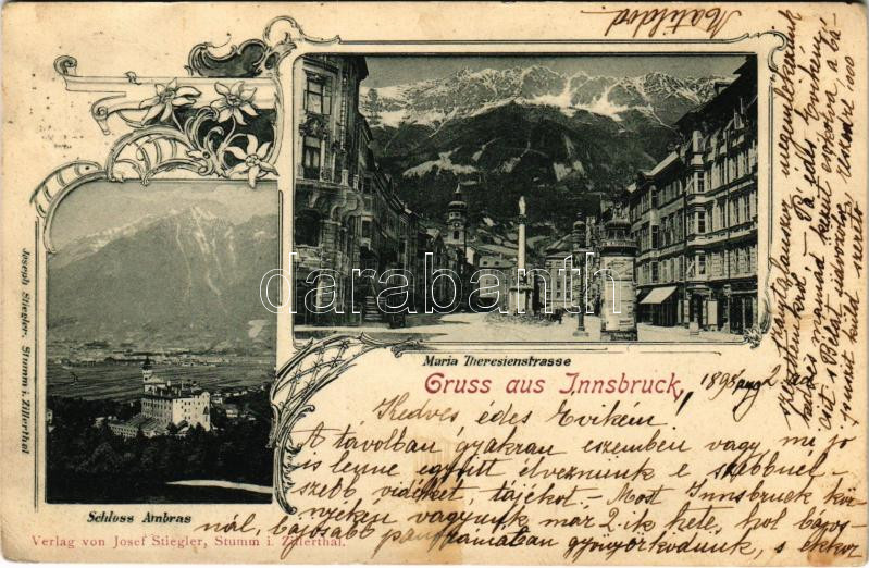 Beschreibung: 1898 (Vorläufer) Innsbruck (Tirol), Schloss Ambras, Maria Theresienstrasse / castle, street. Joseph Stiegler Art Nouveau, floral (Rb)