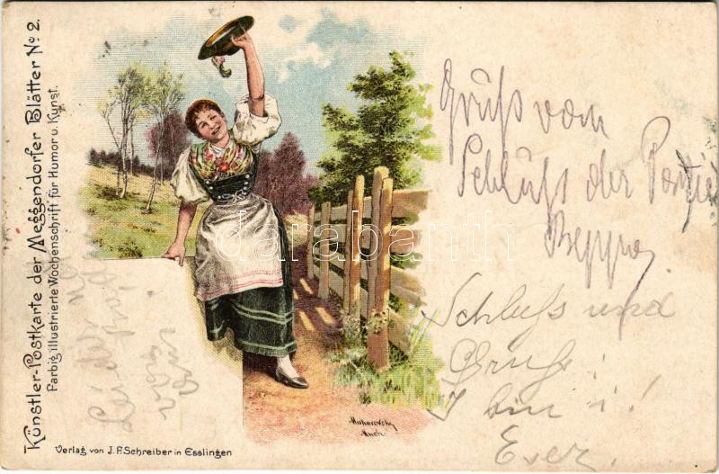 Beschreibung: 1898 (Vorläufer) Tirol, Künstler-Postkarte der Meggendorfer Blätter No. 2. / Tyrolean folklore. Art Nouveau, litho s: Mukarowsky