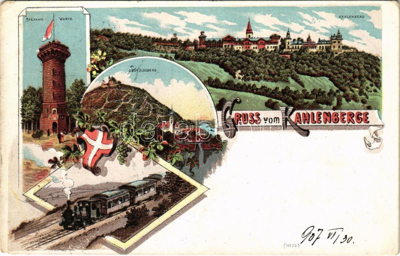 Beschreibung: 1907 Wien, Vienna, Bécs XIX. Kahlenberg, Leopoldsberg, Stefanie-Warte / lookout tower, train, locomotive. Art Nouveau, floral, litho (EK)