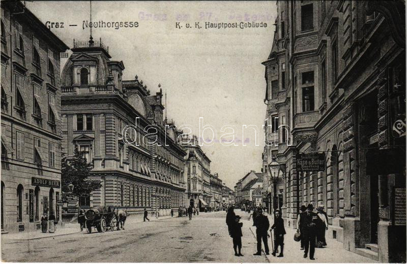 1908 Graz, Neuthorgasse, K.u.k. Hauptpost-Gebäude, Erste Vorarlberger Käse- & Butter Handlung / street, post office, shop of Adolf Beer, cheese and butter shop (Rb)