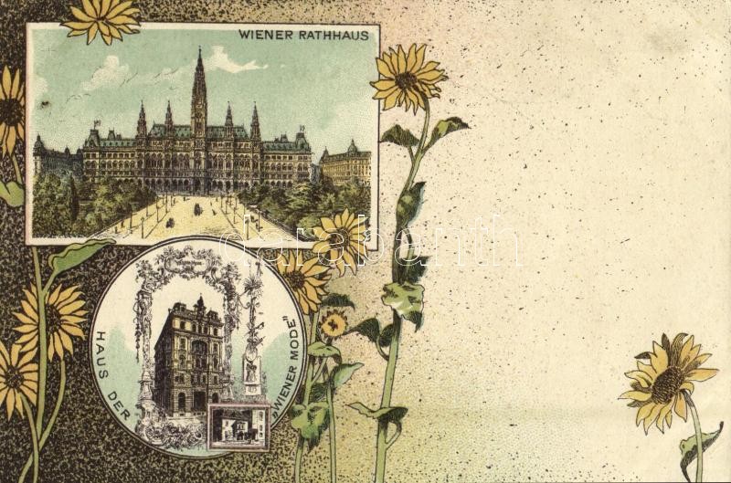 Beschreibung: Vienna, Wien, Bécs; Wiener Rathaus, Haus der Wiener Mode / town hall, house of fashion, Art Nouveau, floral, litho (wet damage)