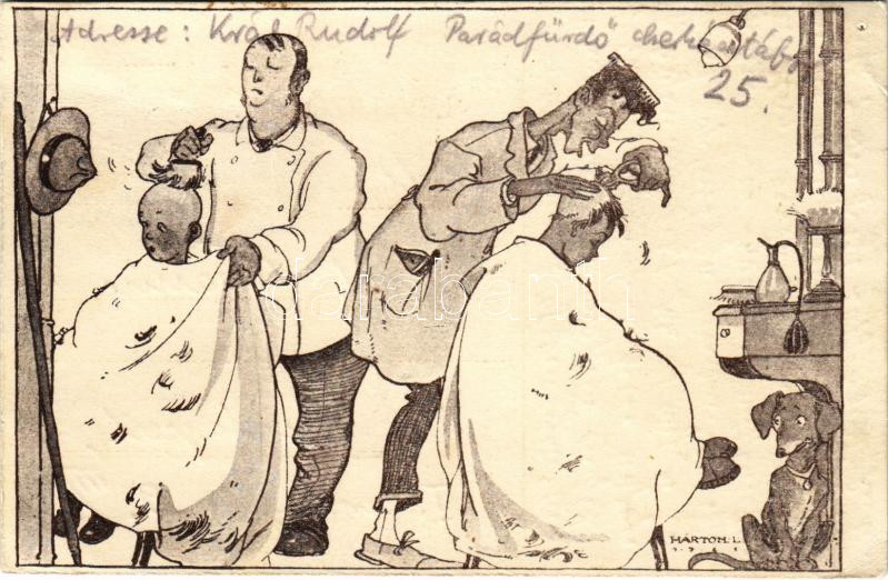 Beschreibung: Készülődés a táborozásra. Cserkészek a borbélynál. R.M. Cserkészcsapatai 1. / Hungarian scout art postcard, barber shop s: Márton L. (lyuk / pinhole)