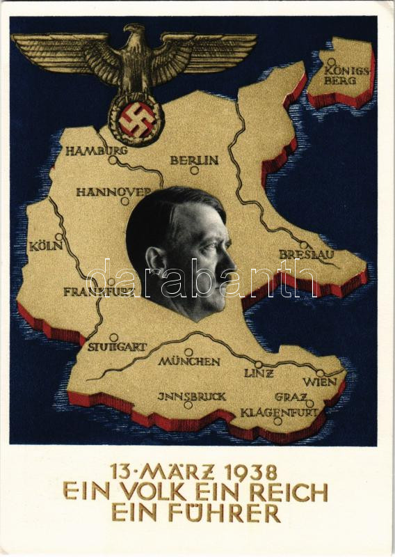 1938 März 13. Ein Volk, ein Reich, ein Führer! / Adolf Hitler, NSDAP G... https://www.darabanth.com/de/472-Fernauktion/472.0/Ansichtskarten/Propaganda-Politik~1500073/1938-Marz-13-Ein-Volk-ein-Reich-ein-Fuhrer-Adolf-Hitler-NSDAP-German-Nazi-Party-propaganda-~II3190374
