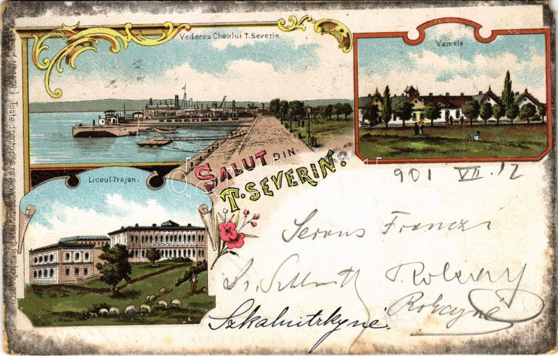 Beschreibung: 1903 Turnu Severin, Szörényvár; Vederea Cheului T. Severin, Vamele, Liceul Trajan / general view, port, customs, grammar school. Art Nouveau, floral, litho (EM)