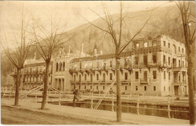 Beschreibung: Slanic-Moldova, Baile Slanic, Szlanikfürdő (Bacau); WWI military, ruins of Hotel Racovita after the fire, K.u.k. soldier. photo (fl)