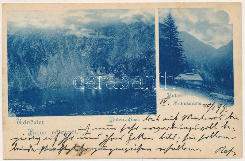 Beschreibung: 1899 (Vorläufer) Fogarasi-havasok (Fogarasi Kárpátok), Fogarascher Karpathen, Muntii Fagarasului; Üdvözlet a Bulea völgyből. Bulea tó (Bilea-tó), menedékház, turistaház / Lacul Balea / lake, rest house, tourist house (EK)