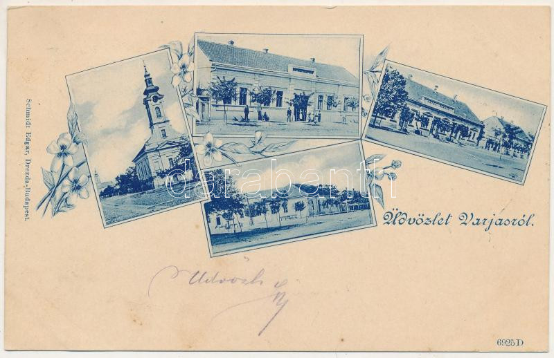 1900 Varjas, Varias; Római katolikus templom, Takarékpénztár, Schnur szálloda, Községháza. Schmidt Edgar kiadása / Catholic church, savings bank, hotel, town hall. Art Nouveau, floral