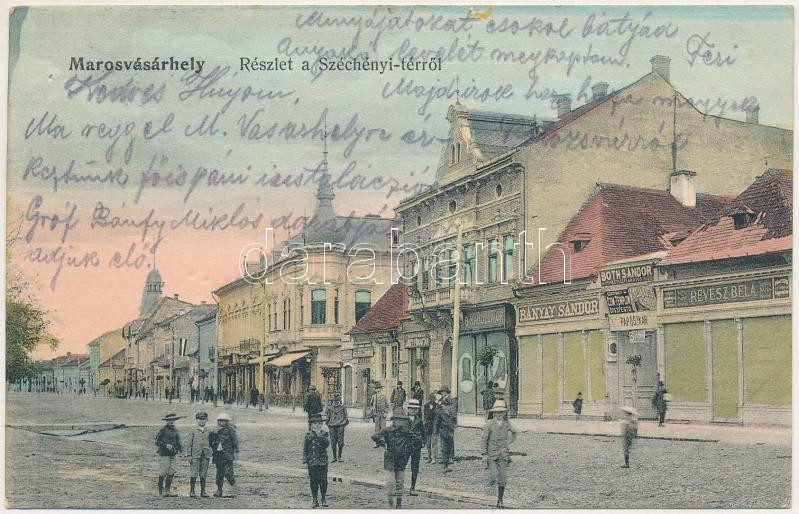 1907 Marosvásárhely, Targu Mures; Széchenyi tér, Révész Béla, Pap Oszkár, Both Sándor, Bányai Sándor, Szentgyörgyi, B. Kandel Mór üzlete. Hirsch Mór kiadása / square, shops (EK)