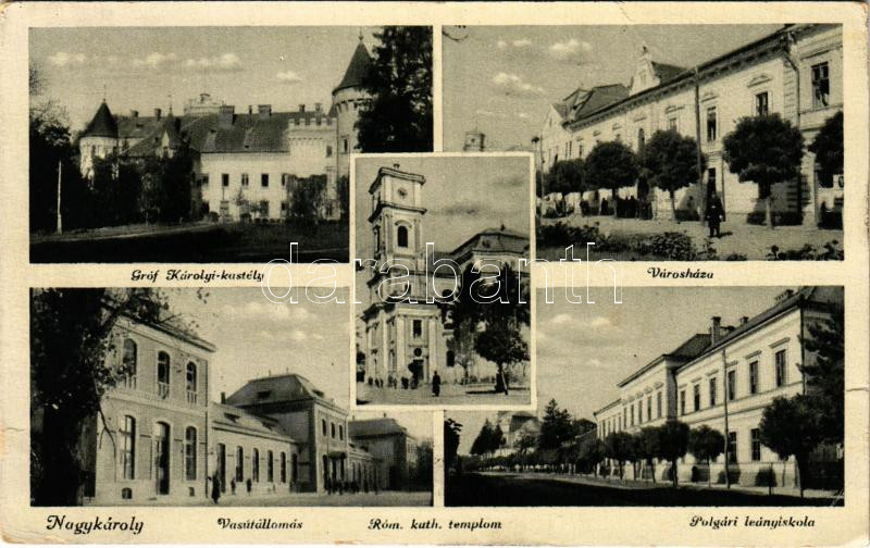 1944 Nagykároly, Carei; Gróf Károlyi kastély, Városháza, vasútállomás, Római katolikus templom, Polgári leányiskola / castle, town hall, railway station, Catholic church, girl school (kis szakadások / small tears)
