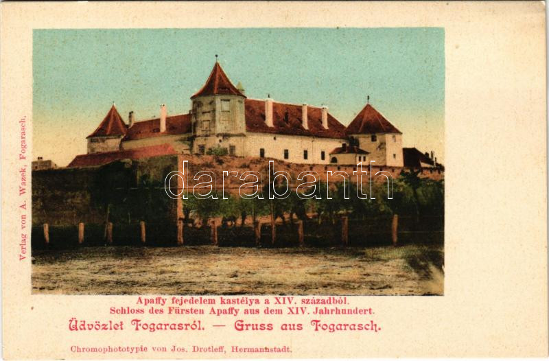 Fogaras, Fagaras; Apaffy (Apafi) fejedelem kastélya a XIV. századból, vár / Schloss des Fürsten Apaffy aus dem XIV. Jahrhundert / castle. Chromophototypie von Jos. Drotleff