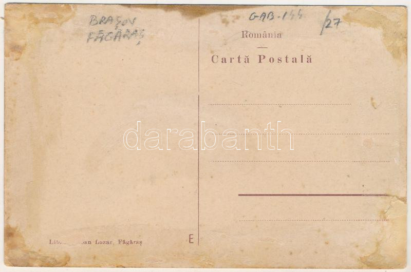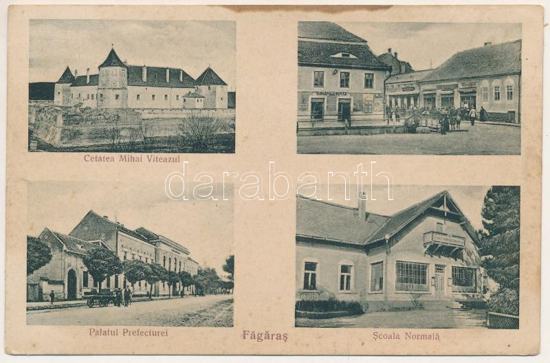 Fogaras, Fagaras; Cetatea Mihai Viteazul, Palatul Prefecturei, Scoala Normala / vár, vármegyeháza, iskola, Eugen Hintz, Joan Lazar üzlete és saját kiadása / castle, county hall, school, shops (ragasztónyom / glue marks)
