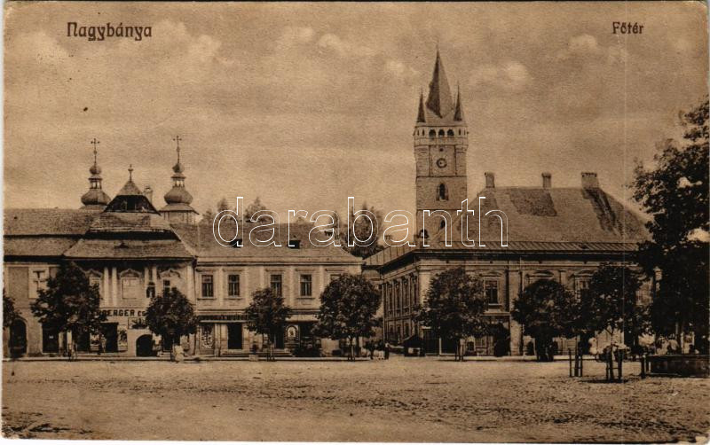 Nagybánya, Baia Mare; Fő tér, Wienerberger és Glavitzky, Rusorán József üzlete, gyógyszertár. Kovács Gyula kiadása / main square, shops, pharmacy (ázott / wet damage)