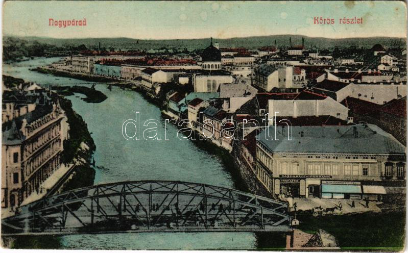Nagyvárad, Oradea; látkép a Körössel, Gazdasági Iparbank, Strohmayer Pál, Jánky Antal üzlete, zsinagóga, híd. Özv. Erényi S.-né kiadása / Cris riverside, bank, shops, synagogue, bridge (fl)