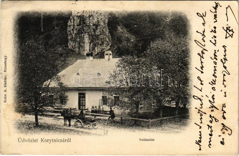 1903 Koritnyica, Korytnica; Vadászlak. Kohn A. kiadása / hunting lodge... https://www.darabanth.com/de/472-Fernauktion/472.0/Ansichtskarten/Slowakei~1500008/1903-Koritnyica-Korytnica-Vadaszlak-Kohn-A-kiadasa-hunting-lodge-villa-kis-szakadas-sma~II3197856