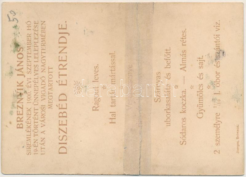 Beschreibung: Selmecbánya, Schemnitz, Banska Stiavnica; Evangélikus lÃceum. Hátoldalon Breznyik János sÃremlékének 1900. évi szeptember hó 19-én történt ünnepélyes leleplezése után a városi vigadó nagytermében megtartott dÃszebéd étrendje. Joerges / Lutheran grammar school. Dinner menu on the backside 12,7 cm x 9 cm (non PC) (r)