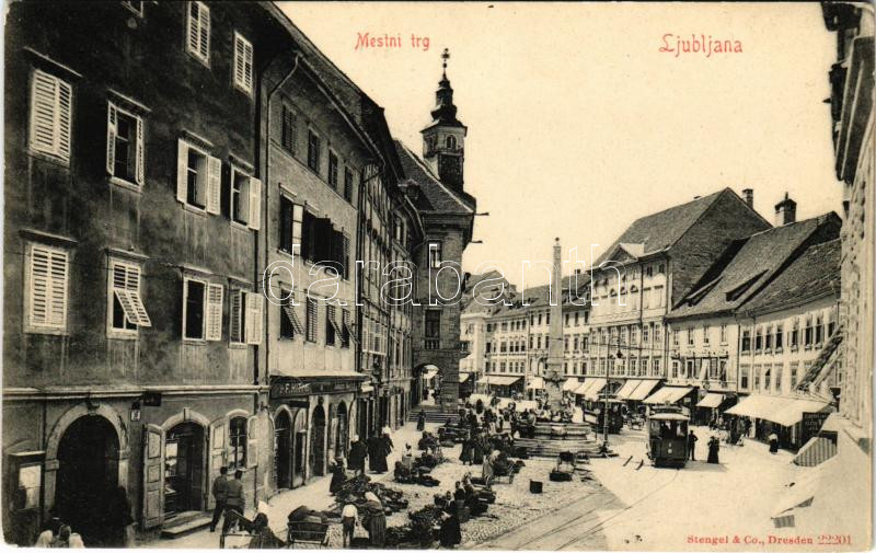 Ljubljana, Laibach; Mestni trg / square, tram, market, shops of F. Hit... https://www.darabanth.com/de/472-Fernauktion/472.0/Ansichtskarten/Slowenien~1500112/Ljubljana-Laibach-Mestni-trg-square-tram-market-shops-of-F-Hiti-and-Johann-Skotiz-fl~II3177244