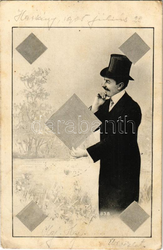 1905 Francia kártya, káró, úriember montázs / French card, Tiles, gent... https://www.darabanth.com/de/472-Fernauktion/472.0/Ansichtskarten/Spielkarten~1500054/1905-Francia-kartya-karo-uriember-montazs-French-card-Tiles-gentleman-montage-fl~II3195119