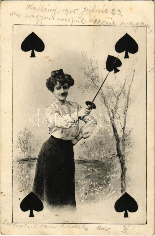 1905 Francia kártya, pikk, hölgy montázs / French card, Pikes, lady mo... https://www.darabanth.com/de/472-Fernauktion/472.0/Ansichtskarten/Spielkarten~1500054/1905-Francia-kartya-pikk-holgy-montazs-French-card-Pikes-lady-montage-fl~II3195126