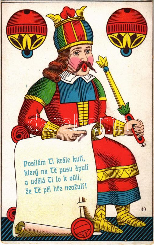 Posílám ti krále kulí, ktery na te pusu spolu a udelá ti to k vuli ze te pri hre neozulí! / Cseh üdvözlőlap, magyar kártya / Chech greeting, German-suited playing card. V.K.K.V.