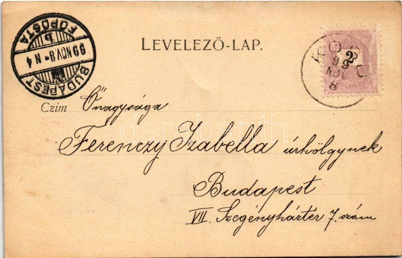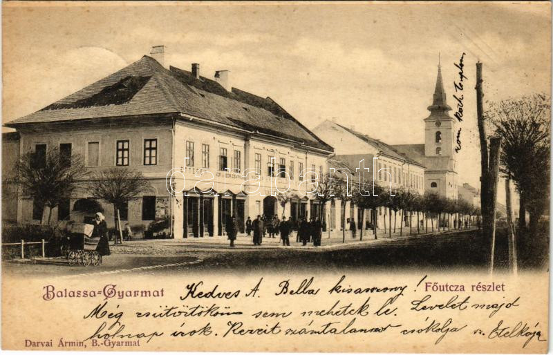 Beschreibung: 1899 (Vorläufer) Balassagyarmat, Fő utca, temlom, Magyar Király szálloda, étterem és kávéház. Darvai Ármin kiadása (EK)