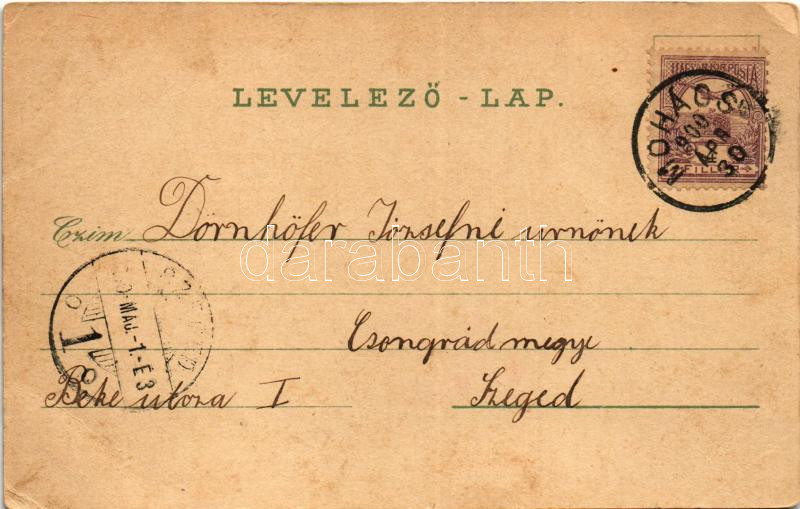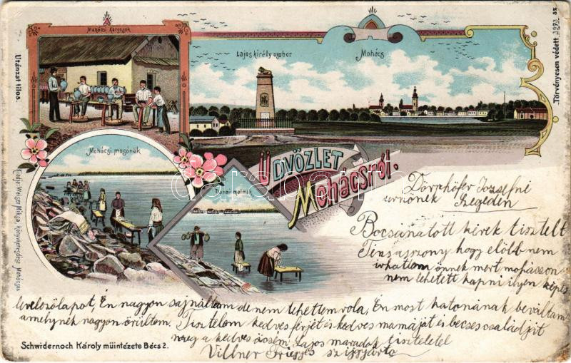 Beschreibung: 1900 Mohács, Lajos király szobor, mosónők és korsósok, dunai úszó hajómalmok, hajómalom. Schwidernoch Károly. Art Nouveau, floral, litho / floating shipmills (EB)