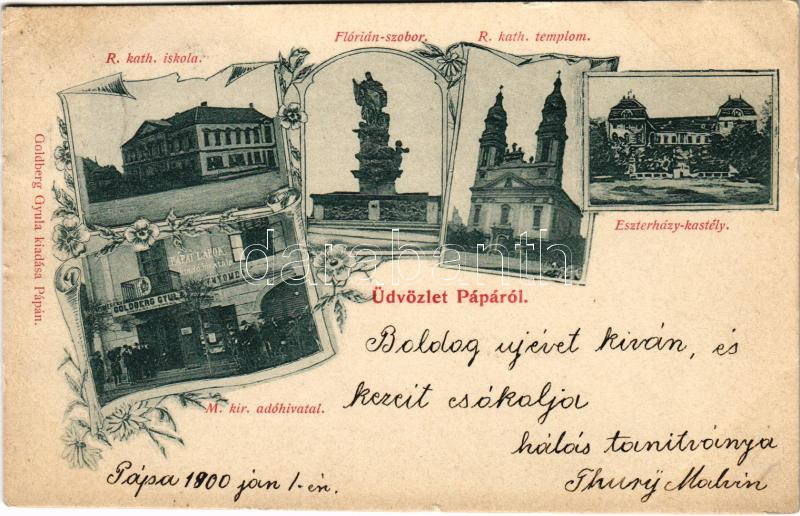 1900 Pápa, Római katolikus templom és iskola, Flórián szobor, Esterházy kastély, M. kir. adóhivatal, Goldberg Gyula üzlete és saját kiadása. Art Nouveau, floral (EK)