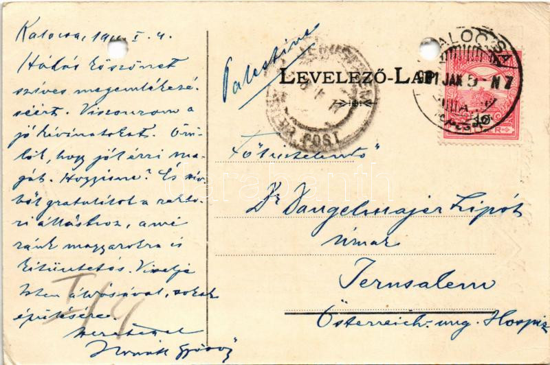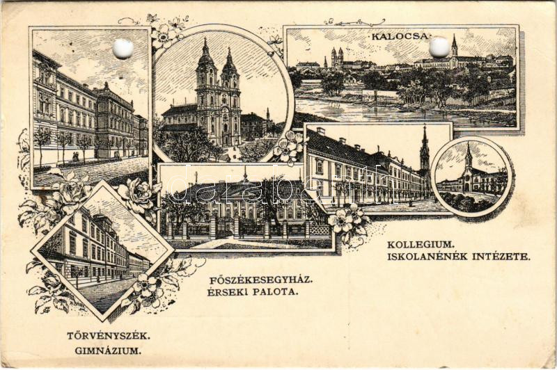 Beschreibung: 1911 Kalocsa, Törvényszék, gimnázium, főszékesegyház, érsekségi palota, kollégium és Iskolanénék intézete. Art Nouveau, floral - Dr. Dangelmayer Lipótnak küldve Jeruzsálembe (lyukasztott / punched holes)