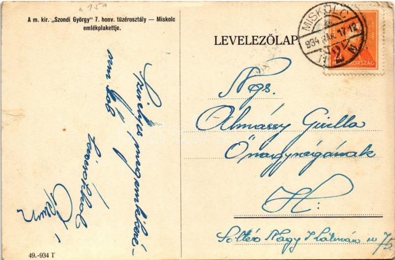 1934 Miskolc, Szondi tüzérek. M. kir. "Szondi György" 7. hon... https://www.darabanth.com/de/472-Fernauktion/472.0/Ansichtskarten/Ungarn~1500006/1934-Miskolc-Szondi-tuzerek-M-kir-Szondi-Gyorgy-7-honv-tuzerosztaly-emlekplakettje-~II3194479