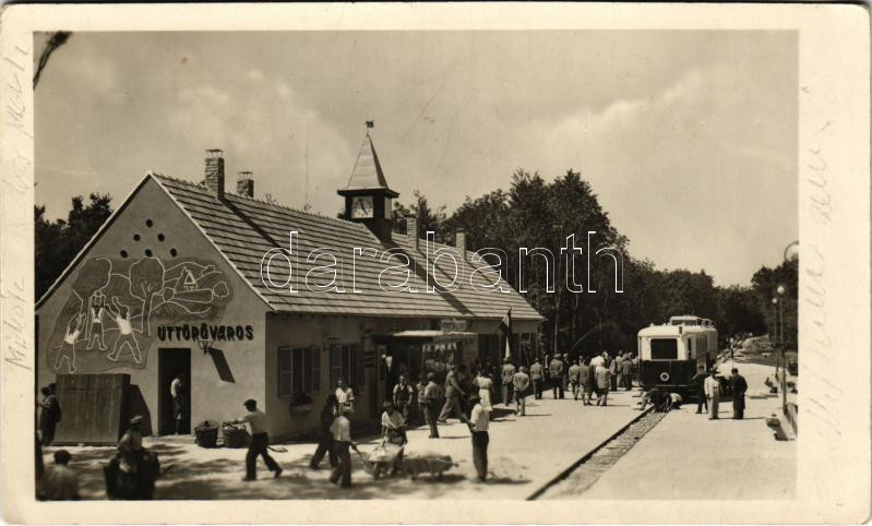 Beschreibung: 1951 Budapest XII. Széchenyi hegyi Úttörő Gyermekvasút az állomáson, vasútállomás, Úttörőváros. Művészeti Alkotások (EK)
