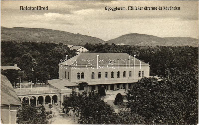Balatonfüred, Gyógyterem, Milleker étterme és kávéháza https://www.darabanth.com/de/472-Fernauktion/472.0/Ansichtskarten/Ungarn~1500006/Balatonfured-Gyogyterem-Milleker-etterme-es-kavehaza~II3197451
