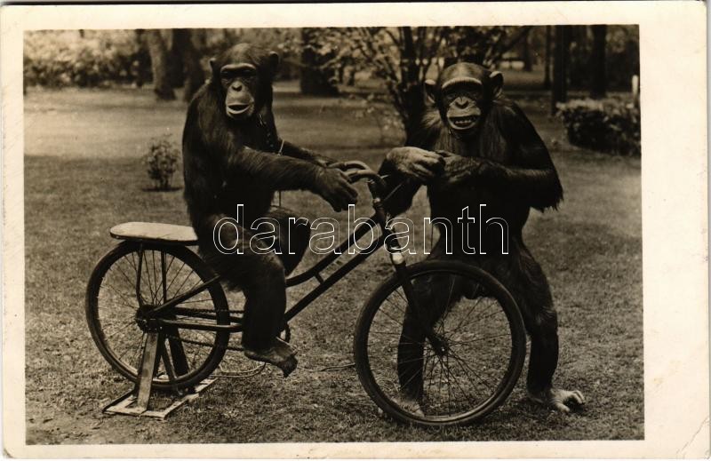 Budapest XIV. Városliget, Zoo Budapest, Kerékpározni tanuló csimpánzok az Állatkertben. Hölzel Gyula felvétele. Kiadja Budapest székesfőváros állat- és növénykertje (EK)