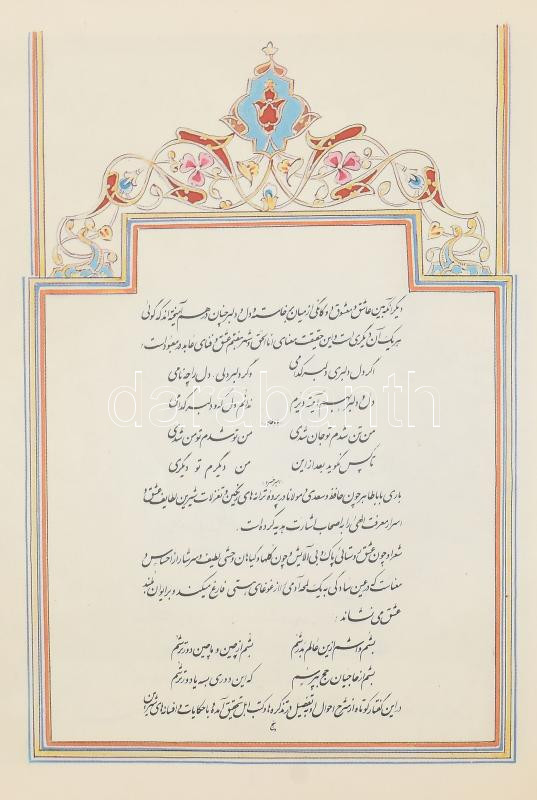 Perzsa kalligrafikus verseskönyv, kissé kopott műbőr kötésben. https://www.darabanth.com/de/472-Fernauktion/472.0/Bucher/Bucher-Andere-Sprachen~500032/Perzsa-kalligrafikus-verseskonyv-kisse-kopott-mubor-kotesben~II3193750