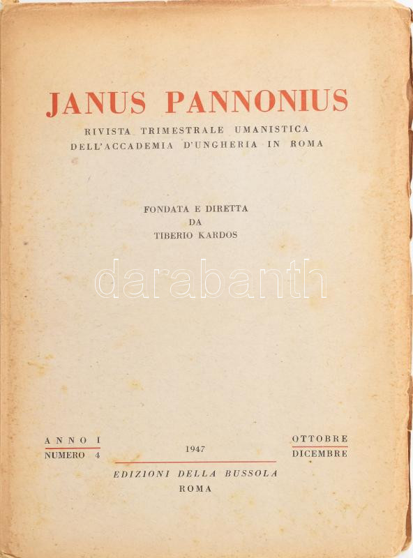 1947 Janus Pannonius: Rivista Trimestrale Umanistica dell'Accademia d'Unheria in Roma. Anno 1. Numero 4. 1947 ottobre dicembre. Fondate e diretta Tiberio Kardos. Roma, 1947 Edizioni della Bussola, 6+555-757+1 p.+ XII t. Olasz nyelven. Kiadói papírkötés, jó állapotban. Felvágatlan lapokkal.