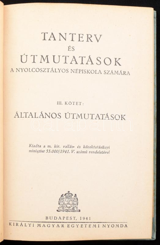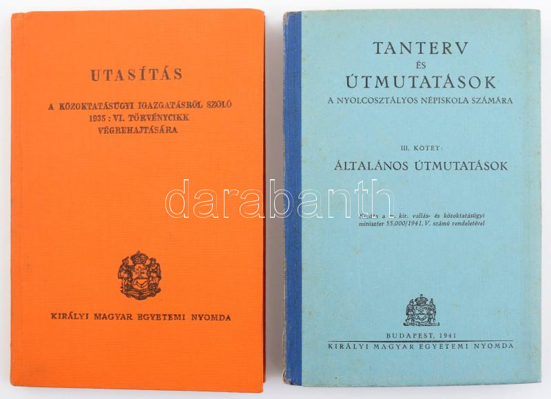 2 db pedagógiai témájú kiadvány: Dr. Hóman Bálint: Utasítás a közoktatásügyi igazgatásról szóló 1935: VI. törvénycikk végrehajtására. Bp., [1936], Kir. M. Egyetemi Nyomda, 116 p. Kiadói egészvászon-kötés. + Tanterv és útmutatások a nyolcosztályos népiskola számára. III. köt.: Általános útmutatások. Bp., 1941, Kir. M. Egyetemi Nyomda, 182 p.+ 20 (kihajtható mellékletek) t. Kiadói félvászon-kötés, minimálisan sérült gerinccel.