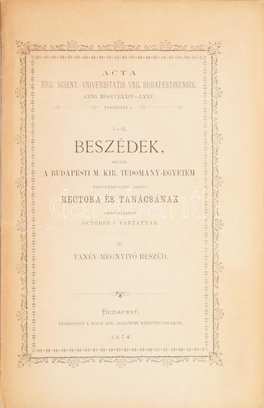 Acta Reg. Scient. Universitatis Ung. Budapestiensis Anni MDCCCLXXIV - LXXV. I-II. Beszédek, melyek a budapesti M. Kir. Tudomány-egyetem MDCCCLXXV. tanévi rectora és tanácsának beiktatásakor octóber 1. tartattak. III. Tanév-megnyitó beszéd. Bp., 1874, M. Kir. Egyetemi Nyomda, 71 p. Kiadói papírkötés. Felvágatlan lapokkal.