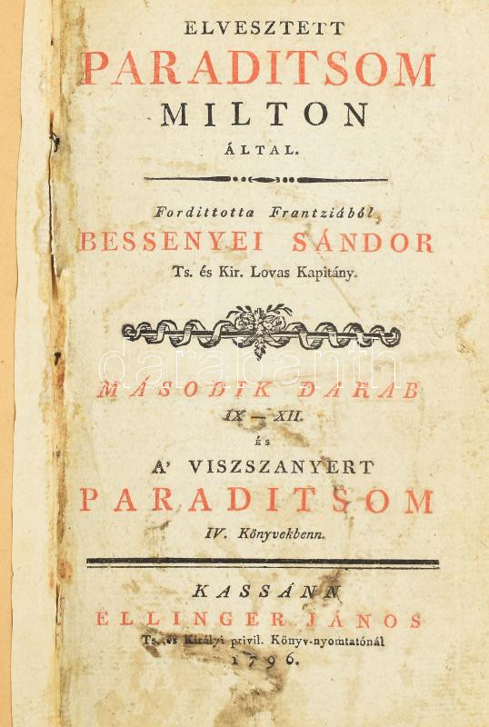 Bessenyei Sándor (ford.): Elvesztett Paraditsom Milton által. Fordítot... https://www.darabanth.com/de/472-Fernauktion/472.0/Bucher/Bucher-Andere-kuriositaten~500036/Bessenyei-Sandor-ford-Elvesztett-Paraditsom-Milton-altal-Forditotta-Frantziabol-7E-II-dar~II3201072