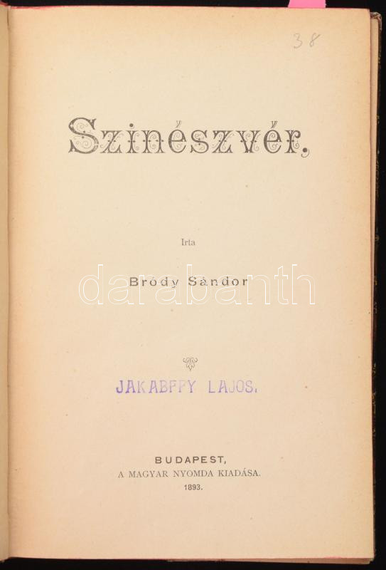 Bródy Sándor: Színészvér. [1-2. köt. Egybekötve.]Bp., 1893, Magyar Nyomda, 149+1+119 p. Első kiadás. Korabeli aranyozott félvászon-kötés, "Singer és Wolfner" felirattal a borítón.