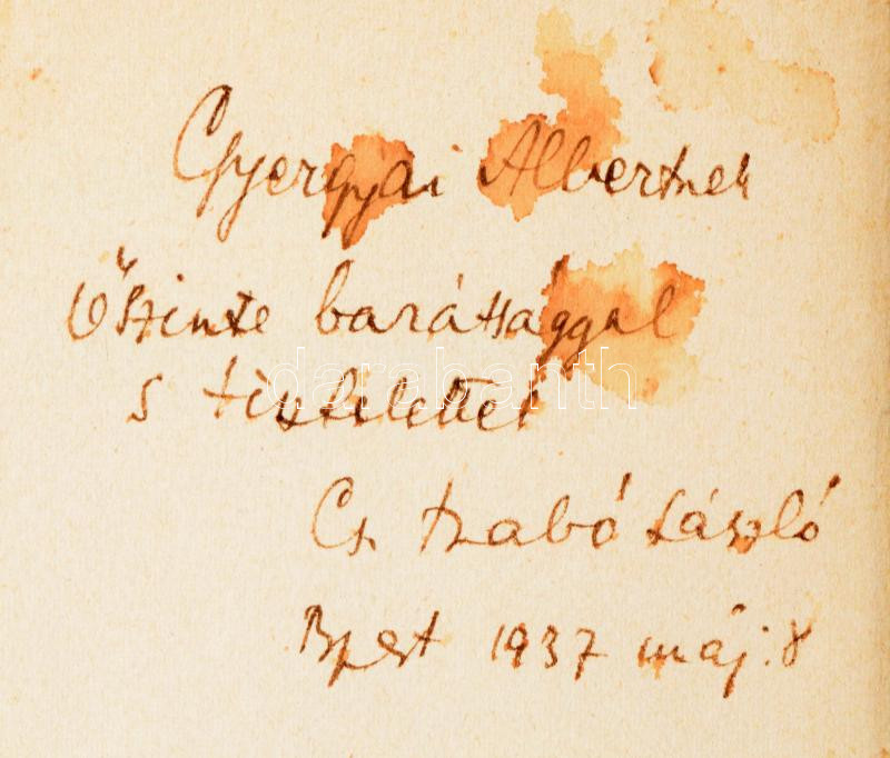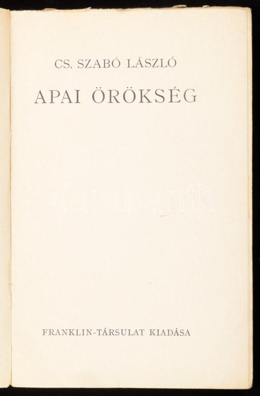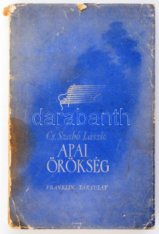 Cs. Szabó László: Apai örökség. A szerző, Cs. Szabó László (1905-1984) Kossuth-díjas magyar író, esszéíró, kritikus által Gyergyai Albert (1893-1981) irodalomtörténész, író, műfordító részére DEDIKÁLT példány! Bp., [1936], Franklin, 177+3 p. Első kiadás! A tartalom jegyzék előtt errata. Kiadói papírkötés, foltos, kopott borítóval, valamint a borítón kis sérülésekkel, foltos elülső szennylappal, javított kötéssel.