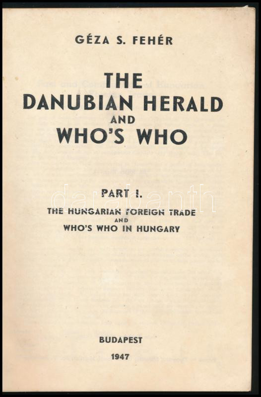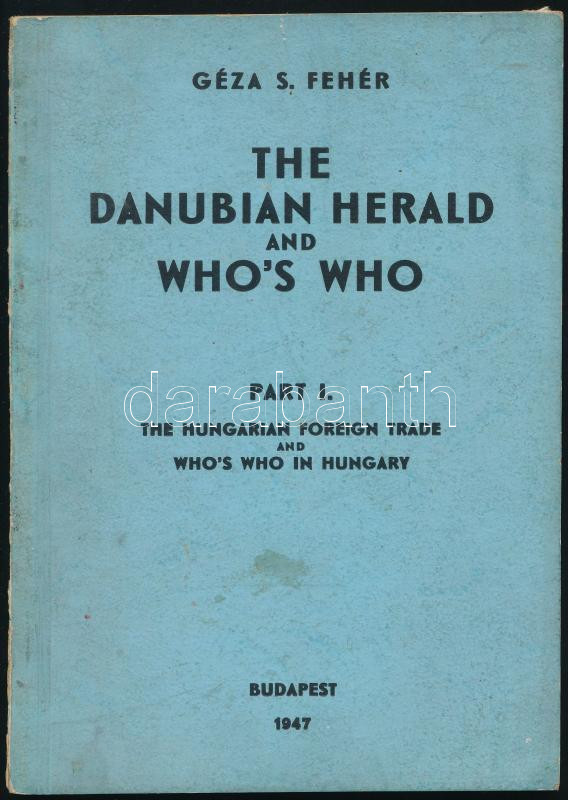 Fehér S. Géza: The Danubian Herald and Who's Who. Part I. The Hungarian Foreign Trade Who's Who in Hungary. Bp., 1947, (Tipográfia Műintézet-ny.), 96 p. Angol nyelven. Kiadói papírkötés, foltos borítóval.