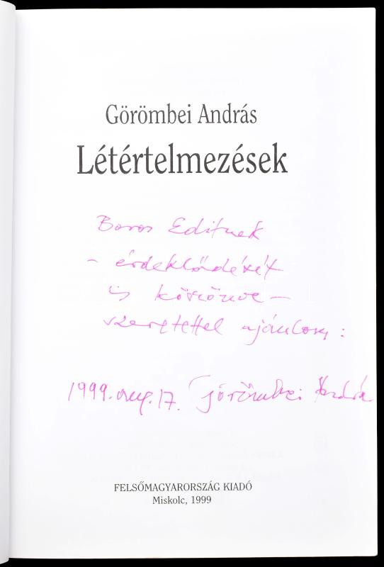 Görömbei András: Létértelmezések. DEDIKÁLT! Miskolc, 1999, Felsőmagyar... https://www.darabanth.com/de/472-Fernauktion/472.0/Bucher/Bucher-Andere-kuriositaten~500036/Gorombei-Andras-Letertelmezesek-DEDIKALT-Miskolc-1999-Felsomagyarorszag-Kiado-Kiado~II3151835