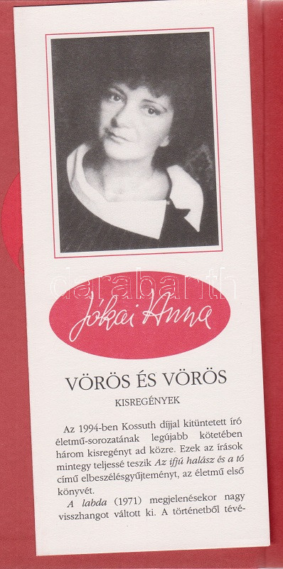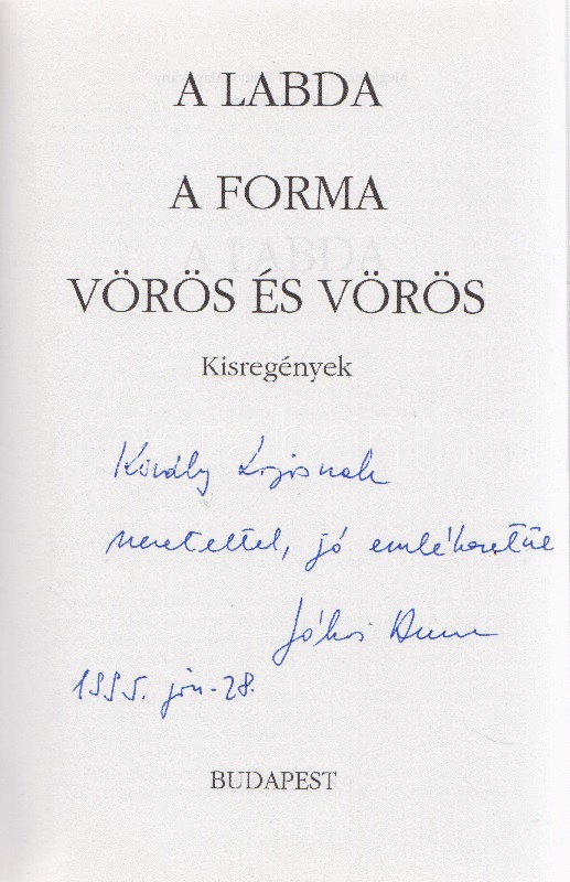 Jókai Anna: A labda. A forma. Vörös és vörös. Kisregények. (Dedikált.) Budapest, (1994). (Széphalom Könyvműhely -Zenemű Nyomda Kft.) 219 + [1] p. + melléklet (sorozatajánló). Első gyűjteményes kiadás. Dedikált: ,,Király Lajosnak szeretettel, jó emlékezetül Jókai Anna. 1995. jún. 28." (Jókai Anna művei.) Prov.: Király Lajos (Király Lajos (1947-2021) költő, szerkesztő, műfordító, a Krúdy Kör elnöke.] Aranyozott kiadói kartonkötésben. Jó példány.