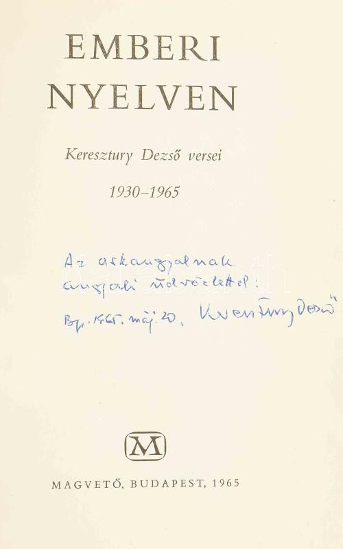 Keresztury Dezső: Emberi nyelven. - - versei 1930-1965. (DEDIKÁLT). Bp., 1965, Magvető. Első kiadás. Kiadói műbőr-kötés, jó állapotban. Megjelent 3200 példányban. A szerző, Keresztury Dezső (1904-1996) Széchenyi-díjas író, költő, irodalomtörténész, kritikus, műfordító által DEDIKÁLT példány: ,,Az arkangyalnak angyali üdvözlettel: Keresztury Dezső, Bp. 1965. máj. 20."
