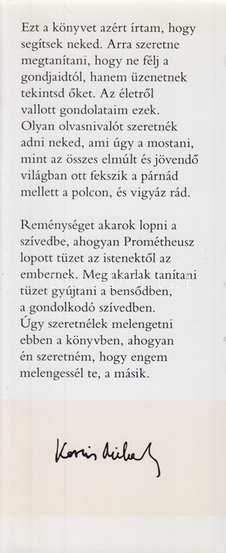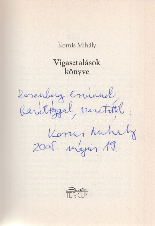 Kornis Mihály: Vigasztalások könyve. (Dedikált.) (Budapest, 2005). Tericum Kiadó Kft. (Dürer Nyomda Kft.) 218 + [6] p. Első kiadás. Dedikált: ,,Rosenberg Ervinnek, barátsággal, szeretettel: Kornis Mihály. 2005. május 19". Példányunkból a hangoskönyv-melléklet hiányzik. Kiadói kartonkötésben, színes, illusztrált kiadói védőborítóban. Jó példány.