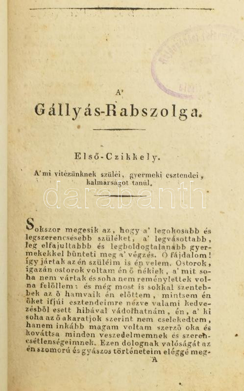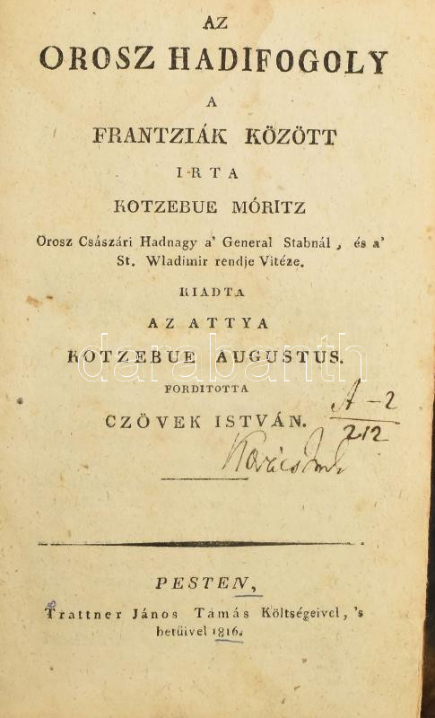 [Kotzbue, Moritz von (1789-1861)] Az orosz hadifogoly a frantziák között. Irta Kotzebue Móritz orosz császári hadnagy a' general stabnál és a' St. Wladimir rendje vitéze. Kiadta az attya Kozebue Augustus [August von Kotzebue]. Ford.: Czövek István. Pest, 1816, Trattner János Tamás, 195 p. Hozzákötve: [Czövek István (1777?-1828): A' gállyás-Rabszolga. vagy: Az én életemnek szomorú történetei. Mellyeket saját jobb kezemmel írtam meg. Magyarázta: - -, ... Pest, 1818, Pest Trattner János Tamás], 5-6+III-IV+13-14+11-12, 17-104 p. Átkötött félvászon-kötés, kopott borítóval, az elülső táblán törésnyommal, az első mű címlapján possessori bejegyzésekkel, az első műben aláhúzásokkal, bejelölésekkel, a második mű címlapja és további 3 lap (7/8., 9/10., 15/16.) hiányzik és az első 4 lap hibás sorrendben kötötték be, kissé foltos lapokkal.
