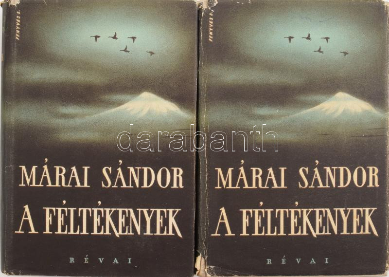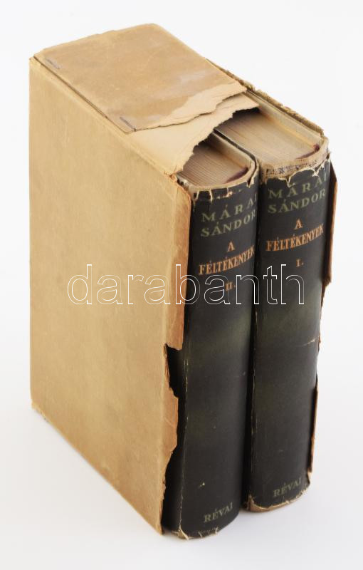 Márai Sándor: A féltékenyek I-II. köt. Bp., 1937, Révai. Első kiadás. A borító rajza Fenyves Sándor (1907-1944) grafikus, illusztrátor, festő munkája. Kiadói egészvászon-kötésben, szakadt kiadói illusztrált papír védőborítóban, sérült, hiányos kiadói kartontokban, laza fűzéssel.