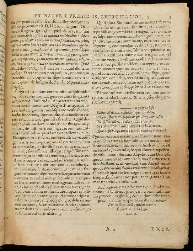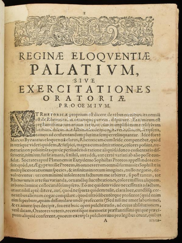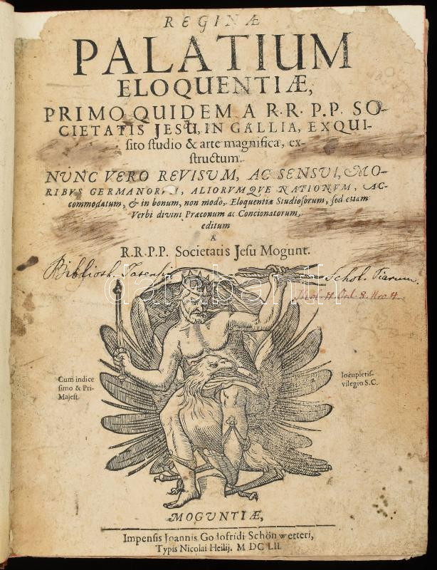 [Retorikai szakkönyv] Reginae palatium eloquentiae, primo quidem a r.r.p.p. Societatis Jesu, in Gallia, exquisito studio & arte magnifica, exstructum. Nunc vero revisum, ac sensui, moribus Germanorum, aliorumque nationum... Moguntiae 1652: Joannis Godofridi Schönwetteri. 892p. + (26). Aranyozott korabeli bőrkötésben, gerincen sérüléssel