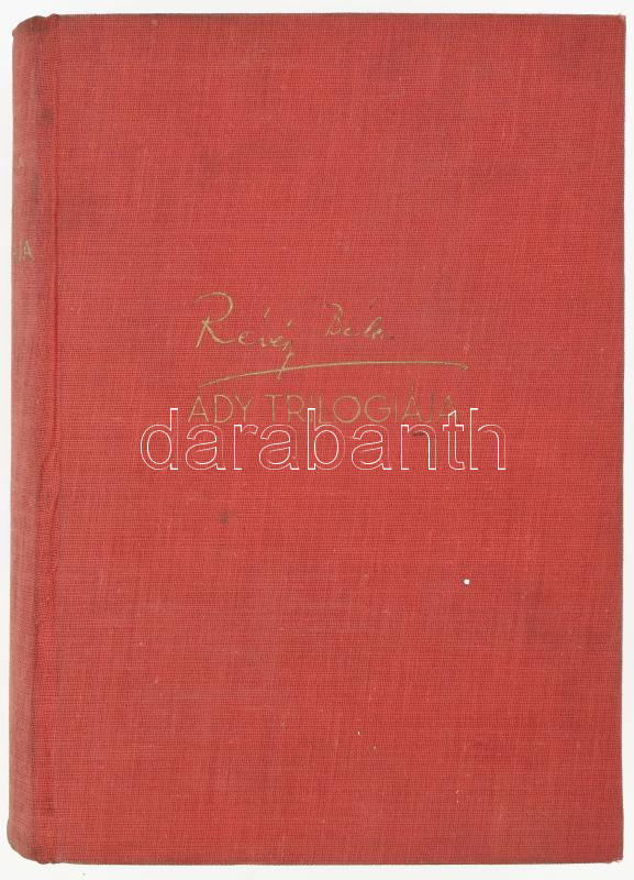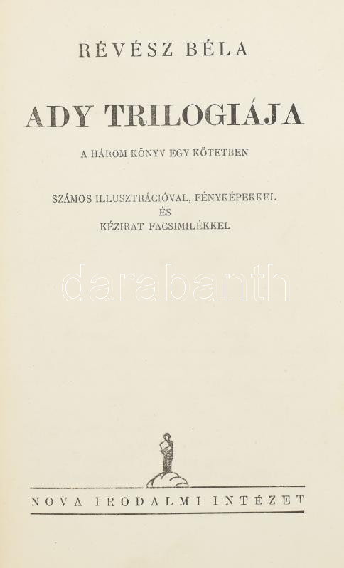Révész Béla: Ady trilógiája. A három könyv egy kötetben. Számos illusztrációval, fényképekkel és kézirat facsimilékkel. Bp., 1935, Nova, 1 t. (címkép, Ady portréja, Székely Aladár felvétele) + 365+(3) p.+ 7 (fekete-fehér képek) t. Kiadói aranyozott egészvászon-kötés, kissé kopott, kissé foltos borítóval, egy tábla hiányzik, néhány lapon bejelöléssel.