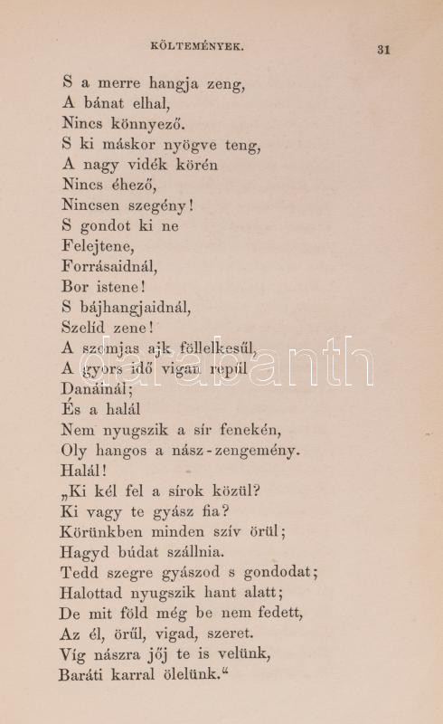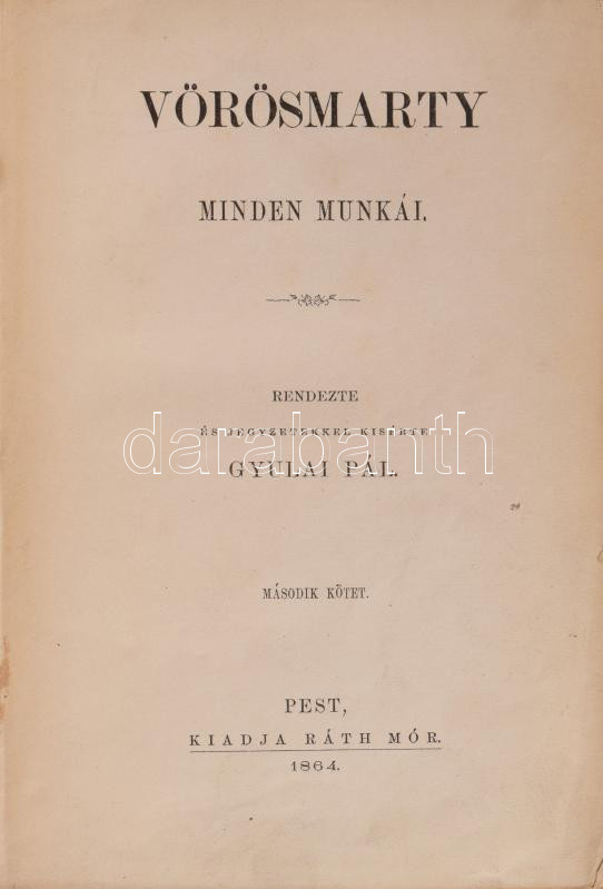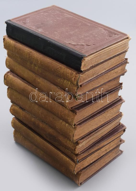 [Vörösmarty Mihály (1800-1855)]: Vörösmarty minden munkái II-V., VI-XII. köt. Rendezte és jegyzetekkel kísérte Gyulai Pál. II. kötet. Lyrai és vegyes költemények. 1835-1855.; III. kötet. Epikai költemények. 1825-1831. (Zalán futása. Cserhalom).; IV. kötet. Epikai költemények. 1825-1831. (Tündérvölgy. A Délsziget. Széplak. Magyarvár. A rom. A két szomszédvár).; V. kötet. Drámai költemények. 1821-1844. (Salamon király. Hábador. A bujdosók).; VII. kötet. Drámai költemények. 1821-1844. (Vérnász. A fátyol titkai. Árpád ébredése).; VIII. kötet. Drámai költemények. 1821-1844. (Marót bán. Az áldozat. Czillei és a Hunyadiak).; IX. kötet. Drámai költemények. Fordítmányok Shakspeareből. 1839-1855. (Julius Caesar. Lear király. Romeo és Júlia).; X. kötet. Beszélyek és regék. 1829-1837. (A holdvilágos éj. A kecskebőr. Orlay. A füredi szívhalászat. Csiga Márton úr viszontagságai. Szél úrfi).; XI. kötet. Vegyes prózai dolgozatok. 1826-1848. (Nyelv és irodalom. Dramaturgiai lapok).; XII. kötet. Vegyes prózai dolgozatok. 1826-1848. (Dramaturgiai lapok. Élet és politika). Ifjukori kísérletek. 1817-1826.; Pest, 1863-1864., Ráth Mór, (Bécs, Jacob és Holzhausen - Pest, Emich Gusztáv-ny.), 8+318 p.;4+292 p.;4+299 p.; 4+446+4 p.; 2+438+1 p.; 2+478+1 p.; 4+406 p.;4+180 p.;4+358;6+548 p. Egységes, korabeli aranyozott egészvászon-kötés, kopott borítókkal, sérült gerincekkel, a II. kötet amatőr modón javított gerinccel, sérült kötéssel, kijáró lapokkal, a III. kötet hiányzó lapokkal (292. oldallal végett ér, 300 oldallal lenne teljes), nagyrészt javított kötésekkel, közte egy kötet gerince amatőr módon javított, a 9. kötetben néhány ceruzás aláhúzással. Megviselt állapotban.