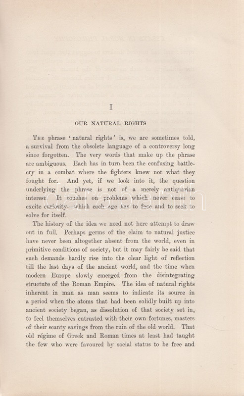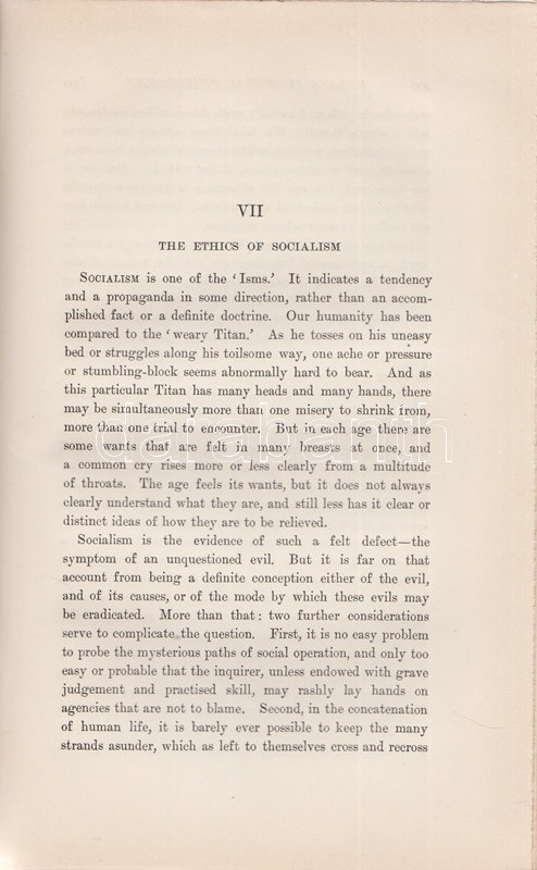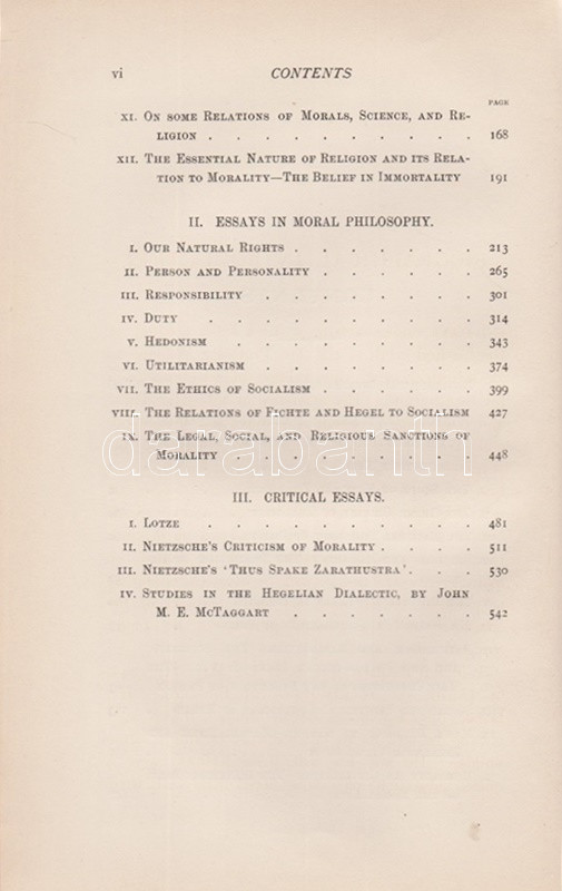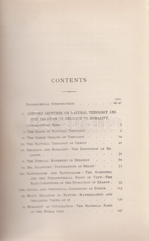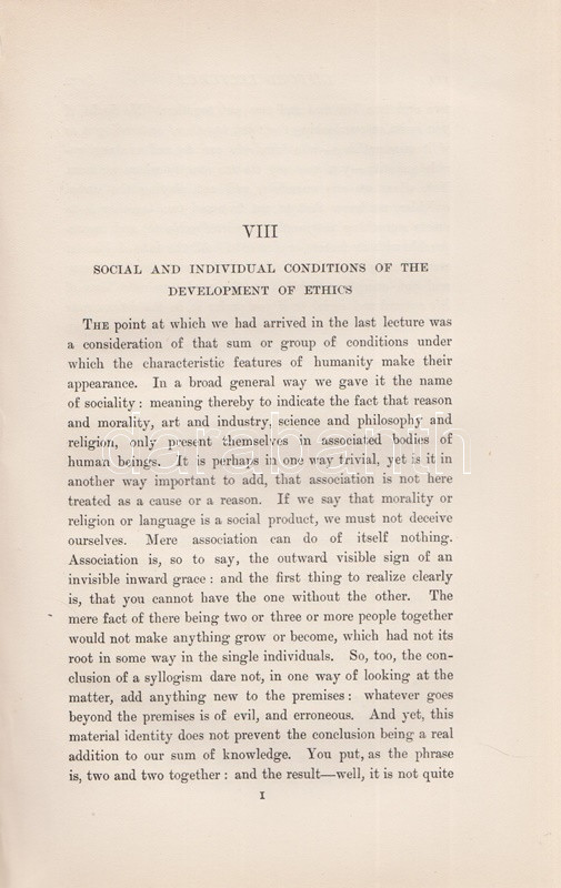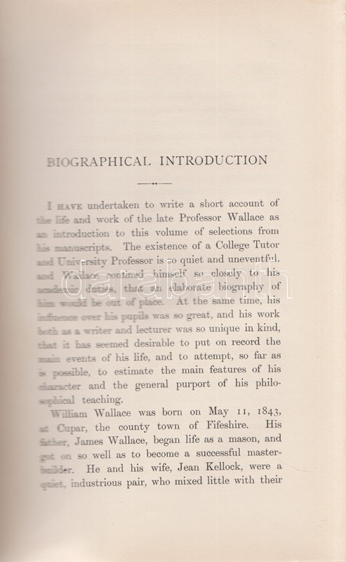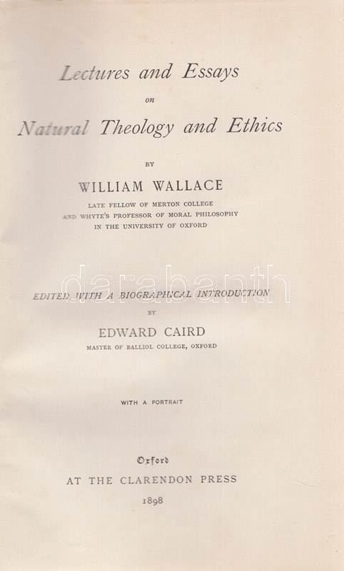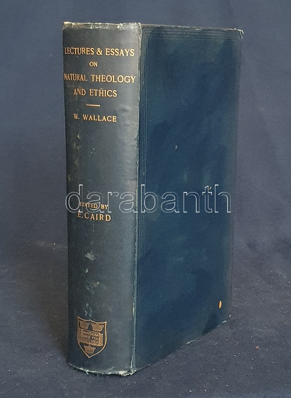 Wallace, William: Lectures and Essays on Natural Theology and Ethics. Edited, with a Biographical Introduction by Edward Caird. Oxford, 1898. (Henry Frowde) The Clarendon Press. 1 t. (hártyapapírral védett címkép) + XL + 566 + [2] + 8 p. Első kiadás. Kötetünk szerzője William Wallace (1847-1897) skót morálfilozófus, ünnepelt oxfordi egyetemi tanár. Munkássága nagyját a német idealista filozófusok ismertetésének szentelte. A tanulmánykötet első harmadában a filozófus által tartott úgynevezett Gifford-előadások leiratai szerepelnek. Az 1890 körül alapított előadás-sorozatot Skócia egyetemein a mai napig évről évre megtartják, mégpedig a tágan értelmezett fiziko-teológia témakörében: az előadások tehát a tudományosság felől vizsgálják a mindenkori vallás és morál témáit. William Wallace 1894-1895-ben tartott tíz előadása történelmi kontextusban vizsgálja gondolkodás, morál és vallás kapcsolatát. A kötet második részében morálfilozófiai tanulmányok. Jellemző címek: Természetjogok - Felelősség - Kötelesség - Hedonizmus - Utilitarizmus [célelvűség] - A szocializmus etikája - Fichte és Hegel filozófiájának kapcsolódása a szocializmus elméleteihez. A kötet harmadik, kritikai esszéket tömörítő része döntően Friedrich Nietzsche frissebb munkáival foglalkozik. Az első előzéken Ex Libris. Aranyozott gerincű, vaknyomásos kiadói egészvászon kötésben. Körülvágatlan, jó példány.