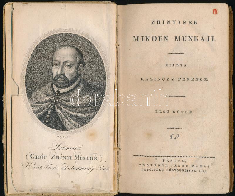 Zrínyi Miklós: Zrínyinek minden munkáji I. kötet: A Zríniász, vagy az ostromlott Sziget. Hős költemény. 1-10. ének. Kiadta Kazinczy Ferenc. Pest, 1817., Trattner János Tamás, 1 (Zrínyi Miklós rézmetszetű portréja, J. G. Mansfeld) t. +189+1 p. Első kiadás. Korabeli kartonált papírkötés, kopott borítóval, javított, kissé hiányos címképpel, ex libris-szekkel.